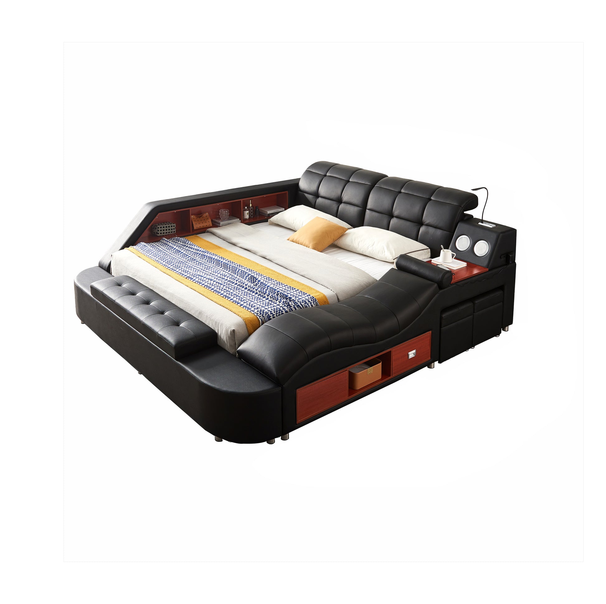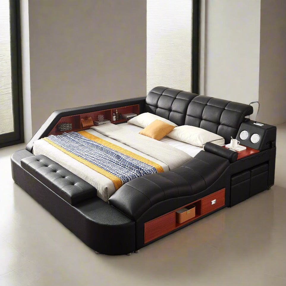 This Eastern King or Queen leather bed is designed for ultimate comfort and style. The sleek leather upholstery, combined with a built-in USB port, light, and Bluetooth speaker, elevates the modern experience. The massage chaise lounge offers relaxation, while the matching ottomans provide extra storage. Assembly is required.