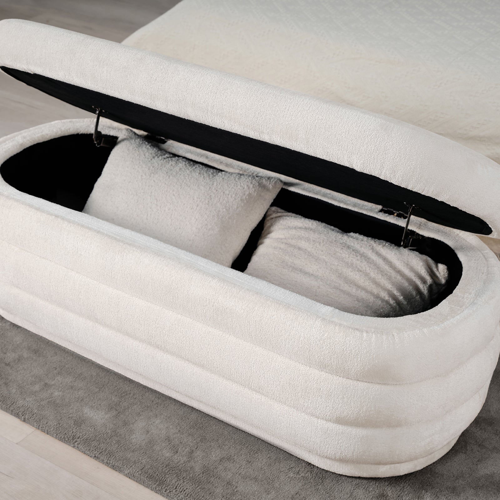 This multifunctional fabric storage bench adds both functionality and style to your space. Crafted from high-quality fabric, foam, plywood, and solid wood, it offers comfort and durability. Its spacious design provides ample storage beneath the soft cushioned seat, making it perfect for organizing your home. The neutral fabric upholstery blends effortlessly with various décor styles, while sturdy plastic legs ensure stability. Whether placed at the foot of your bed, in the entryway, or in the living room, this storage bench is a practical solution for storing extra blankets, pillows, or household essentials.